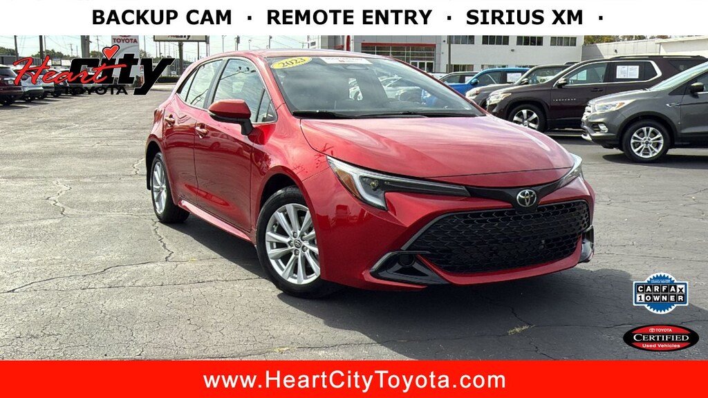 Toyota certified car for sale in Elkhart, IN. Heart City Toyota presents this certified 2023 Toyota Corolla Hatchback for sale with the following factory-installed packages, including::, and Special Color (MSRP $425.00), which increased the original MSRP value by $425.00 for this certified 2023 Toyota Corolla Hatchback SE.