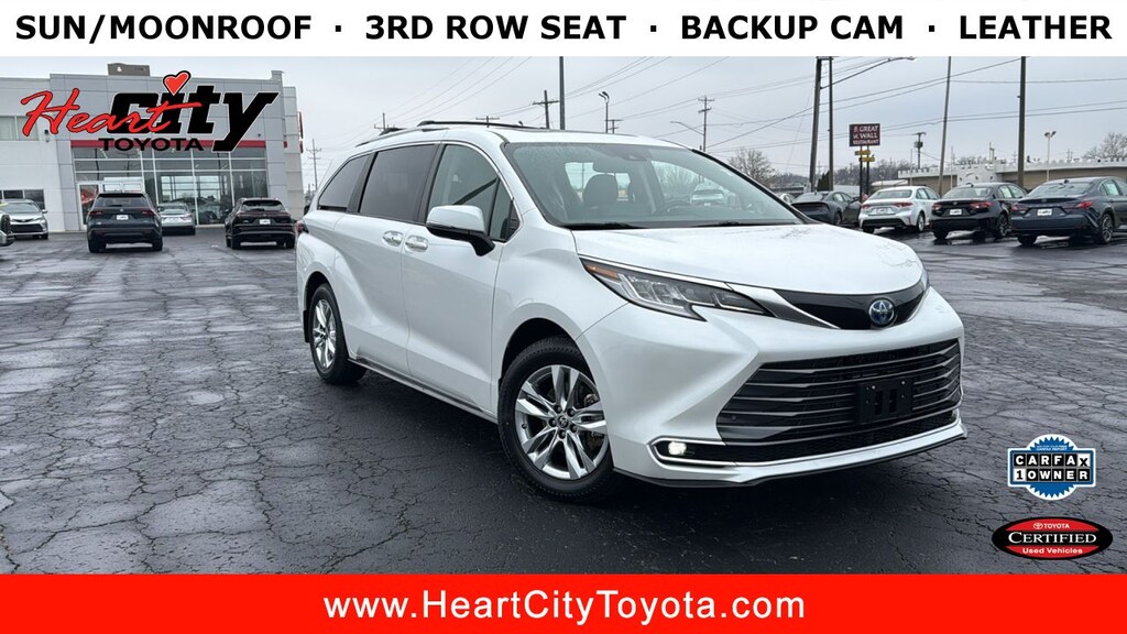 Toyota certified car for sale in Elkhart, IN. Heart City Toyota presents this certified 2024 Toyota Sienna for sale with the following factory-installed packages, including::Engineered To Precisely Fit Your Vehicle, All-weather Floor Liners Are Made From Flexible, Weather-resistant Material. • Full Coverage For Second And Third Rows •skid-resistant Backing And Driver-side Quarter-turn Fasteners Help Keep The (MSRP $260.00), Genuine Toyota Paint Protection Film Helps Protect The Paint Finish From Chips And Scratches. •multiple Film Layers Of Durable, Nearly Invisible Urethane Help Provide Protection •designed For Specific Sections Of The Vehicle That Are Mos (MSRP $439.00), Provide Additional Secure Tie-down Points For A Variety Of Roof Rack Accessories •le, Xle, And Xse Models Require Optional Side Rails To Accommodate Roof Rack Cross Bars (MSRP $210.00), Made Of High-grade, Nearly Invisible Urethane Film, Appliqué Helps Protect The Rear Bumper Surface From Unsightly Scrapes And Scratches. ••custom-tailored To Fit Select Sienna Models (MSRP $69.00), Mudguards (MSRP $150.00), and Precisely Machined, Weight-balanced Alloy Wheel Locks Help Secure Your Wheels And Tires Against Theft. •resistant To Lock-removal Tools And Secured By A Single Unique Key (MSRP $65.00), which increased the original MSRP value by $1,193.00 for this certified 2024 Toyota Sienna Limited.